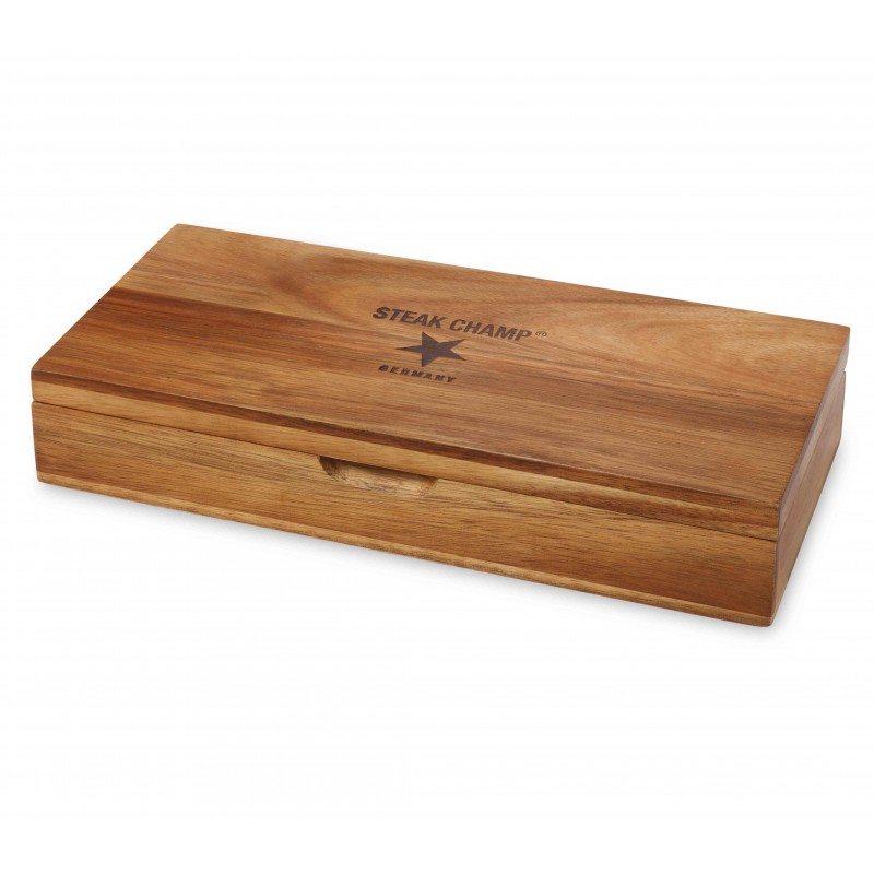 Šių kepsnių peilių ašmenys pagaminti iš X50CrMoV15 plieno (4116 Klingenstahl). Tai aukštos kokybės lydinys, kuris užtikrins, kad peiliai ilgai išliks aštrūs. Kepsnių peiliai yra su mikro dantytu kraštu, kad būtų užtikrintas aštrumas ir atsparumas bukimui. Lengvai supjaustykite mėsą naudodami šiuos kepsnių peilius. Nerūdijantis plienas padeda išlaikyti jų ašmenis be rūdžių. Kepsnių peilių rinkinio rankenos pagamintos iš patvarios akacijos medienos, apdailintos nerūdijančio plieno dangteliais ir trigubomis kniedėmis. Kepsnių rinkinio rankenos taip pat labai patogios laikyti.