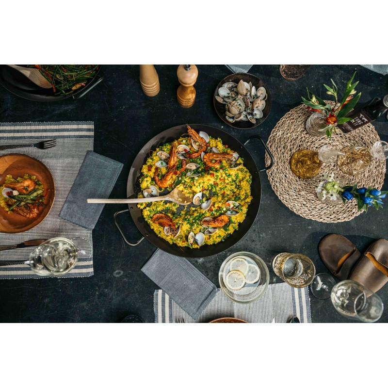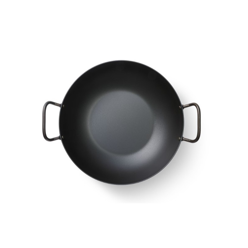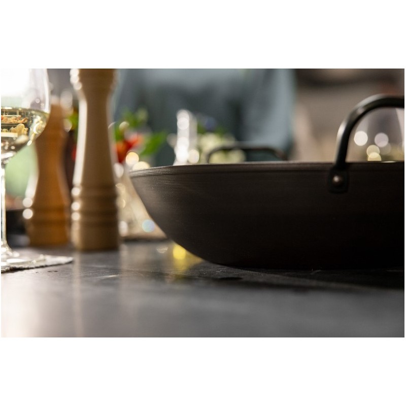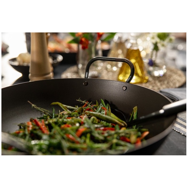 Ši anglies plieno wadjan keptuvė yra itin tvirta ir tinka visiems kepimo paviršiams. Keptuvės skersmuo – 34cm, o pati keptuvė nėra lengva, tad tikrai niekad nesulinks. Tvirto metalo dėka, keptuvė yra praktiškai nesunaikinama ir tarnaus labai ilgai. Anglies plienas greitai įkaista ir gali atlaikyti dideles temperatūras, tad tai yra puikus pasirinkimas troškinimui, skrudinimui, mėsai ar žuviai. Rankenėlės iš abiejų keptuvės pusių leidžia ją lengvai pakelti.
