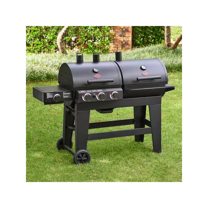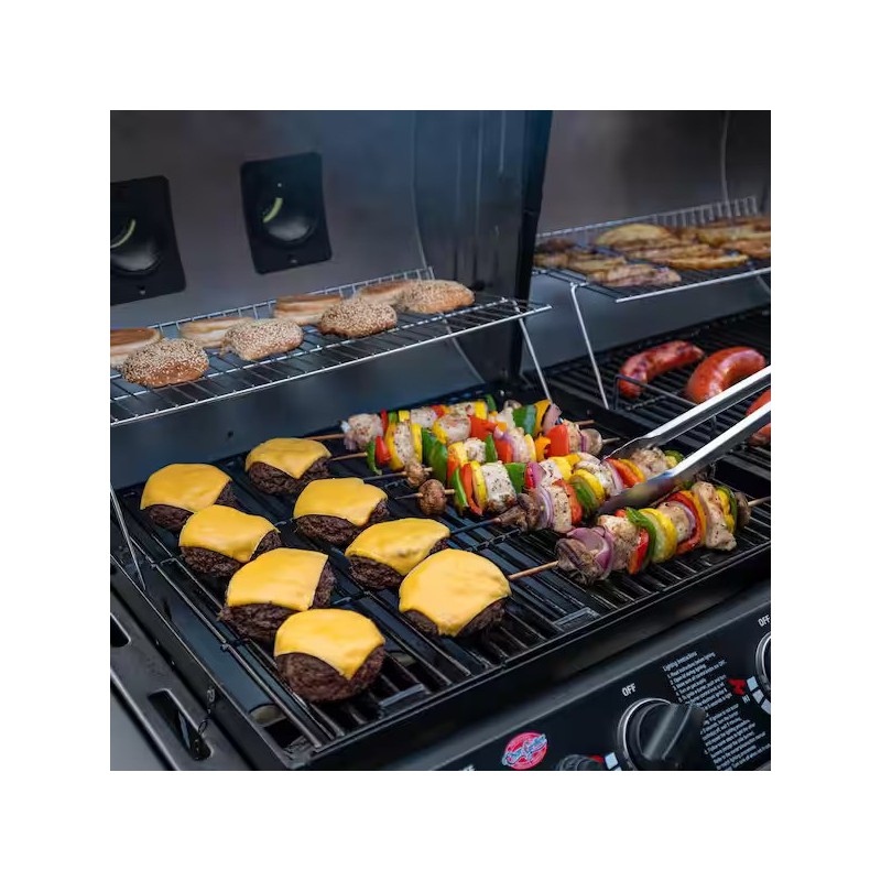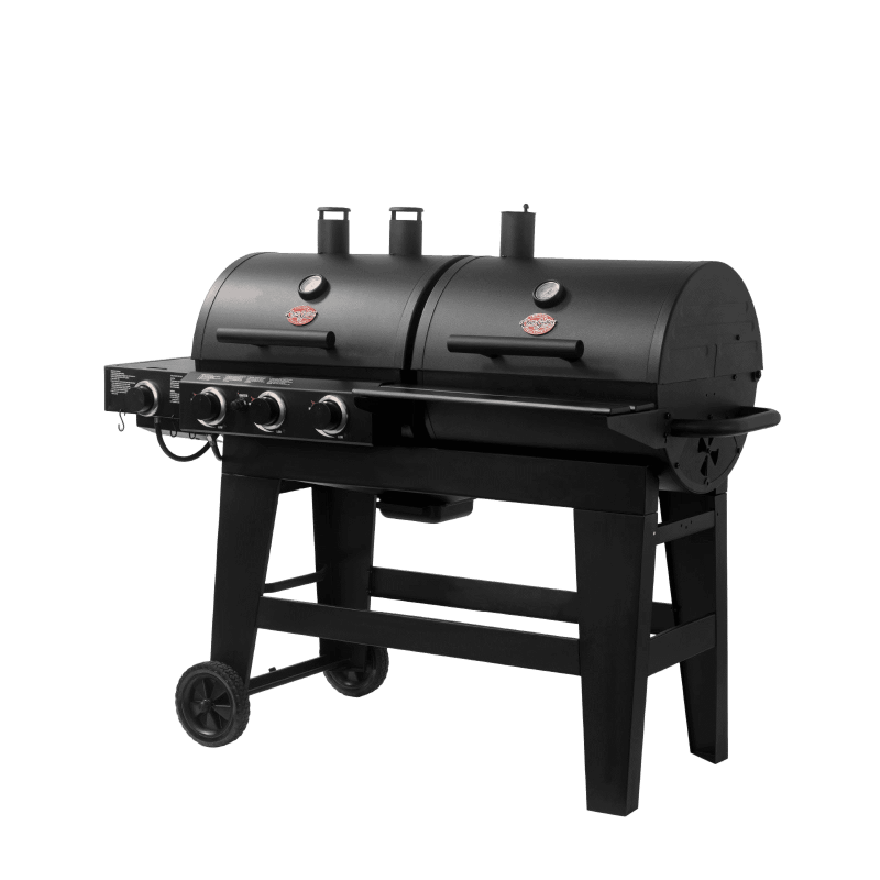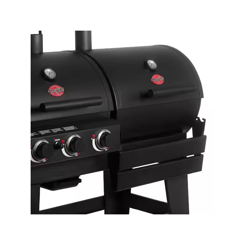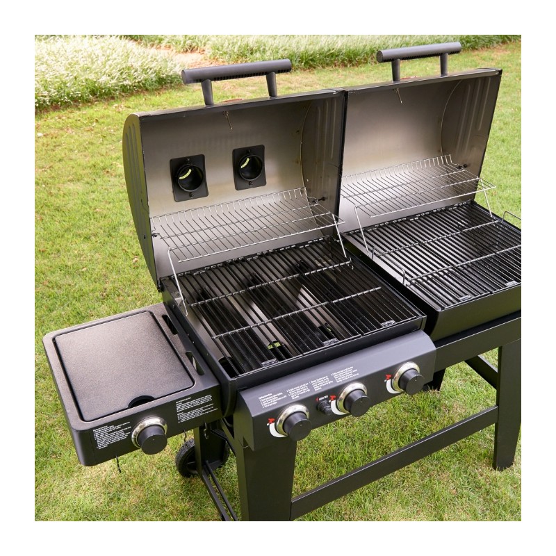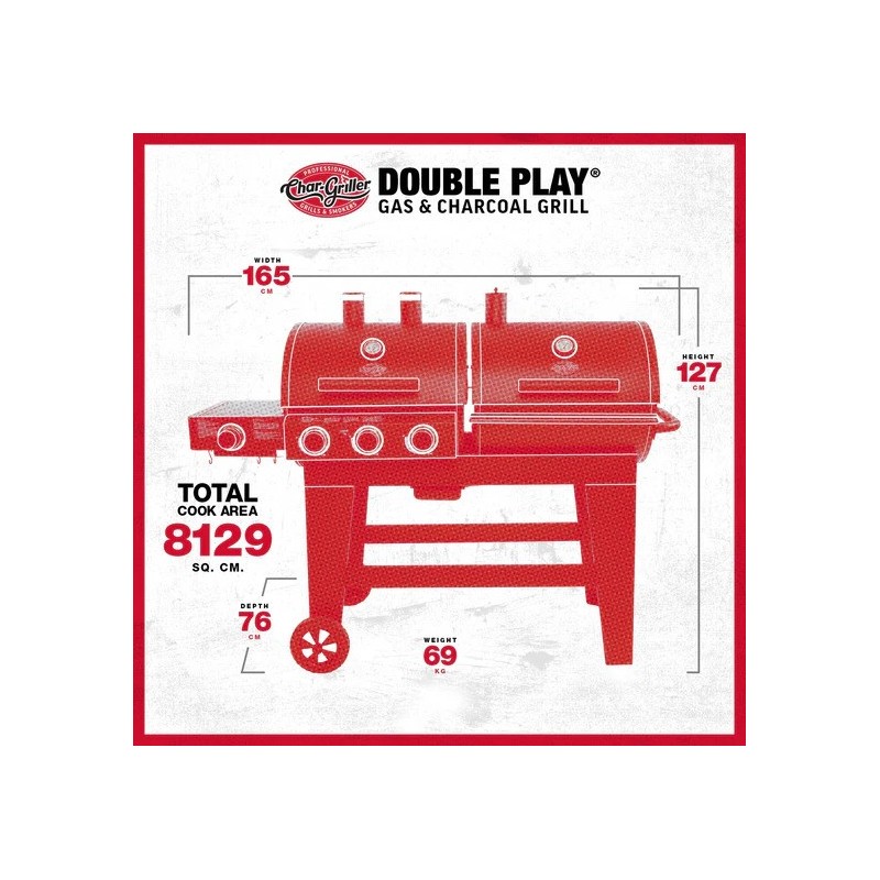 Char-Griller Double Play leidžia mėgautis tiek dujiniu, tiek angliniu kepimu vienu metu – viena pusė skirta dujoms, kita – anglims, o papildomas šoninis degiklis leidžia gaminti padažus, garnyrus ar kažką apvirti prieš kepimą.