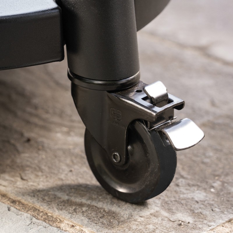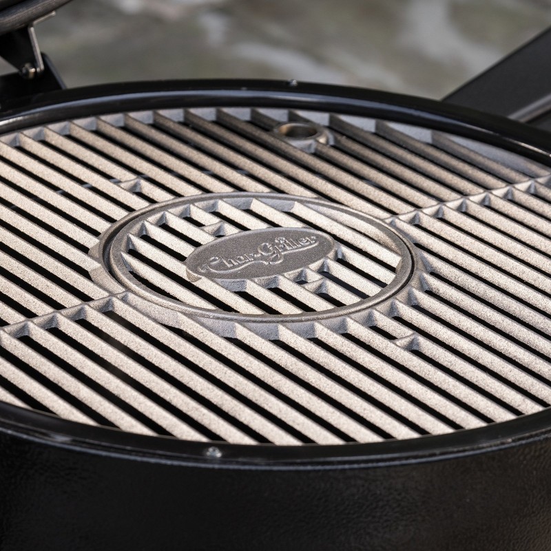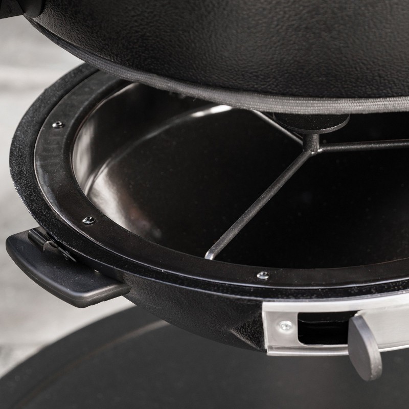 Komplektuojamas su plieninėmis šoninėmis lentynomis patogiam ruošimui. 50cm diametro ketaus kepimo grotelės, suteikia didelį kepimo plotą, o papildomas komplekte esantis nerūdijančio plieno grotelių aukštas padės sutalpinti daugiau produktų. Naudojant Rūkymo akmenį-deflektorių (parduodamas atskirai) galėsite rūkyti maistą žemoje temperatūroje.