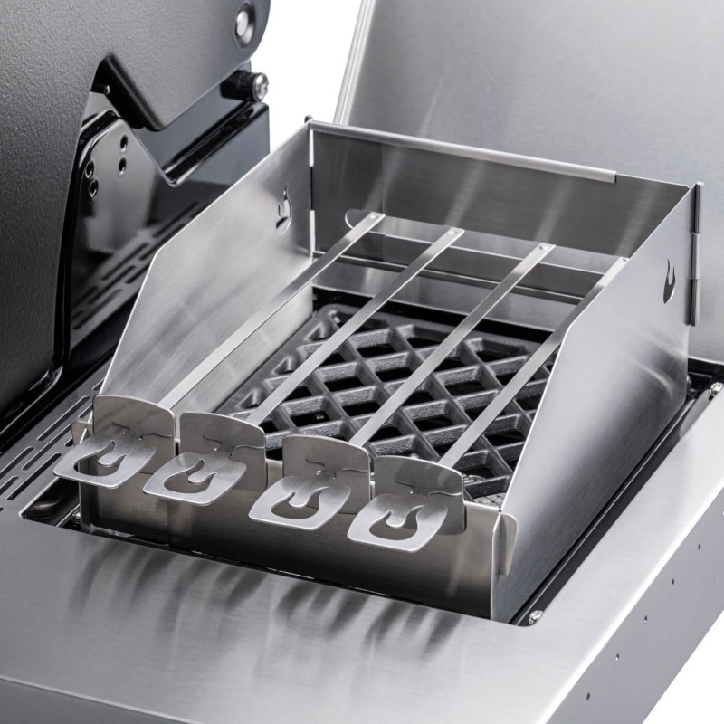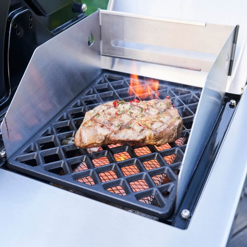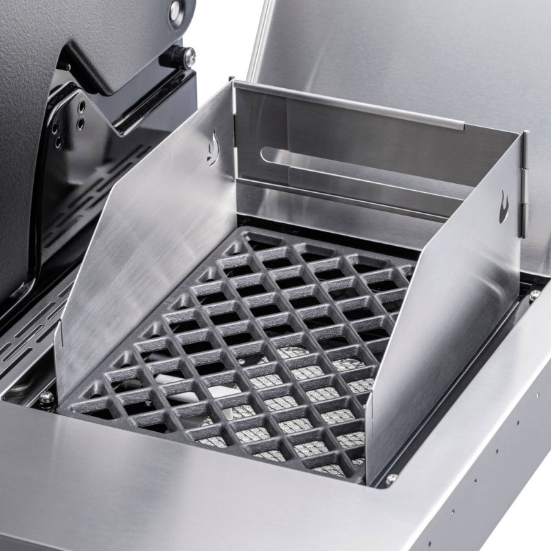 Ši apsauga apsaugos jūsų gaminamą maistą nuo vėjo gūsių, tad patiekalai iškeps lygiai ir vienodai. Apsauga taip pat turi įmontuotus iešmelius maisto kepimui.