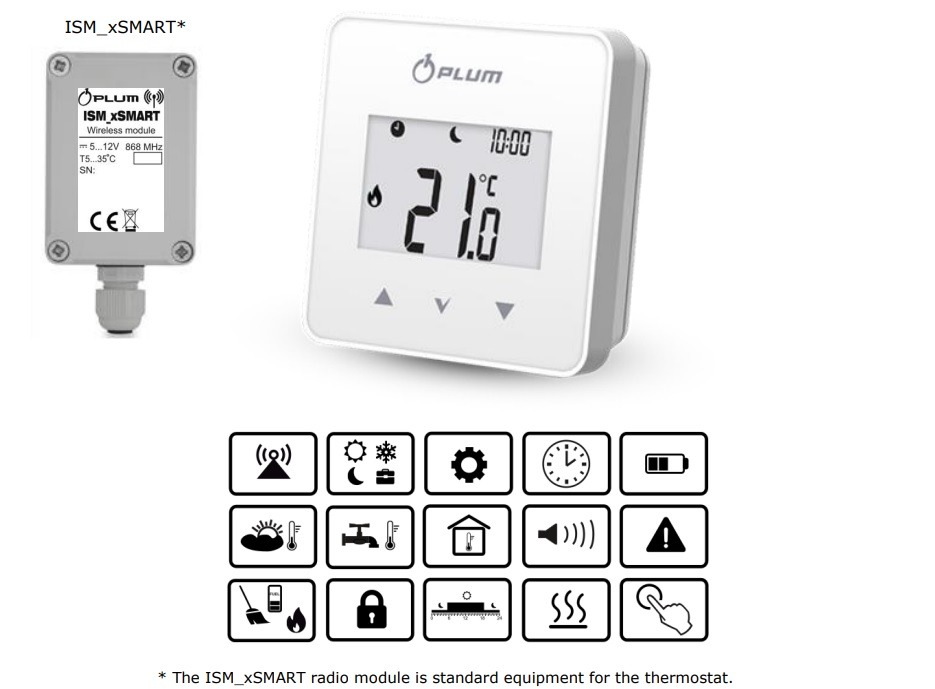 - Termostatas LCD ekrane rodo informaciją apie kambario temperatūrą, pasirinktą darbo režimą, dabartinį laiką ir datą.