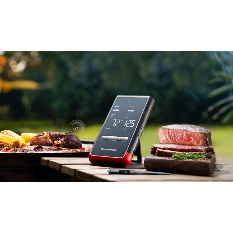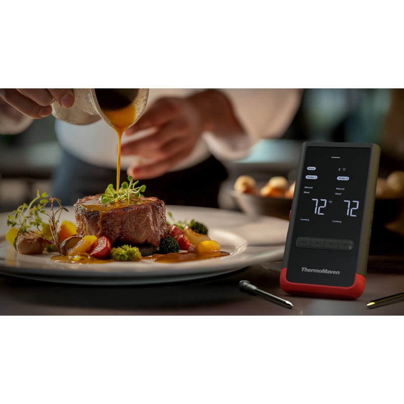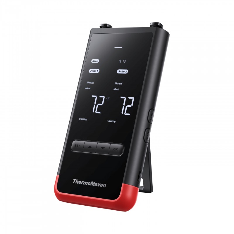 ThermoMaven P2 – tai belaidis mėsos termometras griliui, rūkyklai ir orkaitei, leidžiantis vienu metu sekti 2 patiekalus (arba dvi mėsos zonas) su visiškai belaidžiais zondais. Komplekte yra išmanioji bazė su ekranu, kuri rodo temperatūras realiu laiku ir leidžia nustatyti tikslus be programėlės, o norint itin detaliai stebėti procesą galima naudoti išmaniąją programėlę.