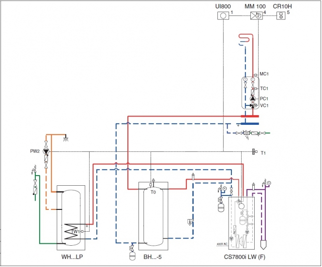 - UI 800 reguliatorius su spalvotu 5" jutikliniu ekranu kontroliuoja karšto vandens ruošimą ir 1 šildymo kontūrą be maišytuvo