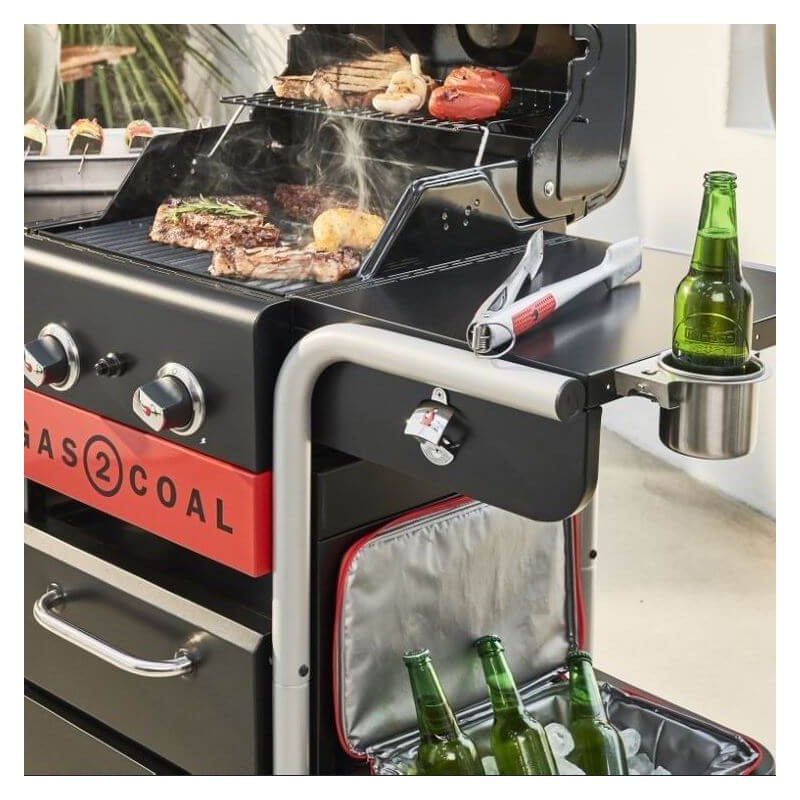 Su šiuo gėrimų laikikliu kepdami karštą vasaros dieną, visada rasite kur pasidėti savo šaltą gėrimą. Tvirtas perforuotas butelių laikiklis tvirtinamas prie jūsų Char-Broil grilio šoninės lentynos. Taip pat yra integruotąs butelio atidarytuvas.