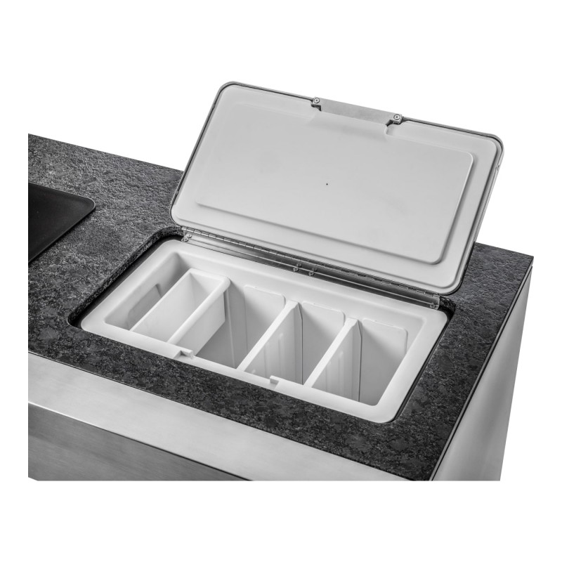 Yra integruota pjaustymo lenta, išimama ledo dėžė ir ištraukiamas šiukšlių konteineris.