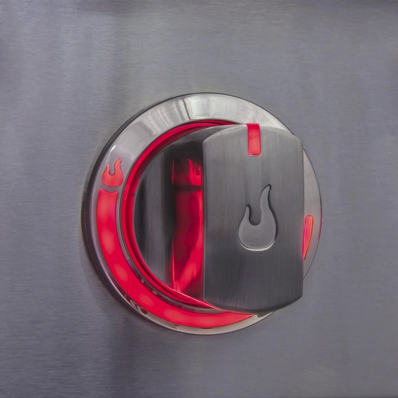 Temperatūros reguliatoriuose įmontuotos raudonos LED lemputės šviečia, kai įjungiamas atitinkamas degiklis.