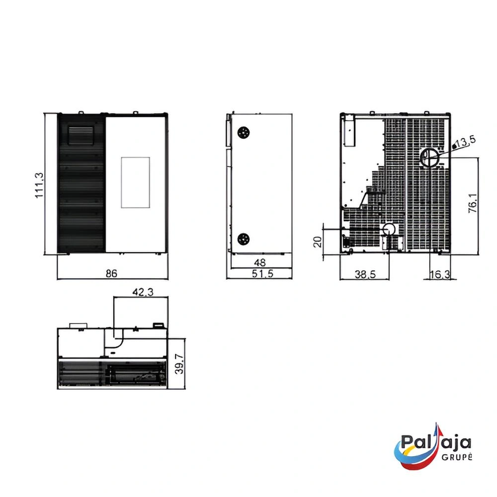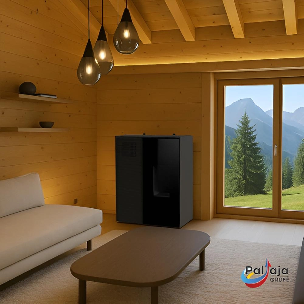 - Vasarą įsijungia integruotas vėsinimo modulis, veikiantis kaip moderni oras-oras sistema, užtikrinanti efektyvų, tolygų ir tylų vėsinimą. Abi funkcijos yra visiškai atskiros: granulės šildymui, vėsinimo blokas vėsinimui. Montavimas paprastas ir kompaktiškas: reikia tik vienos sienos angos, nereikia išorinio įrenginio ar kondensato drenažo.
