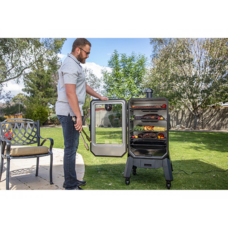 Pit Boss PRO V4P – tai išmani, talpi ir patogi vertikali granulinė rūkykla, skirta tiems, kurie nori ryškaus dūmo aromato ir stabilios kontrolės be sudėtingo proceso. Didelis 6948 cm² kepimo plotas, 29 kg bunkeris, PID valdymas ir Wi-Fi/Bluetooth funkcijos paverčia šį BBQ grilį patikimu pasirinkimu rūkymui, kepimui ir lėtam lauko gaminimui viso sezono metu.