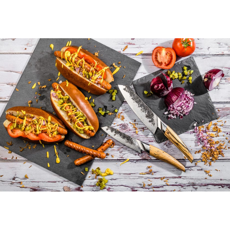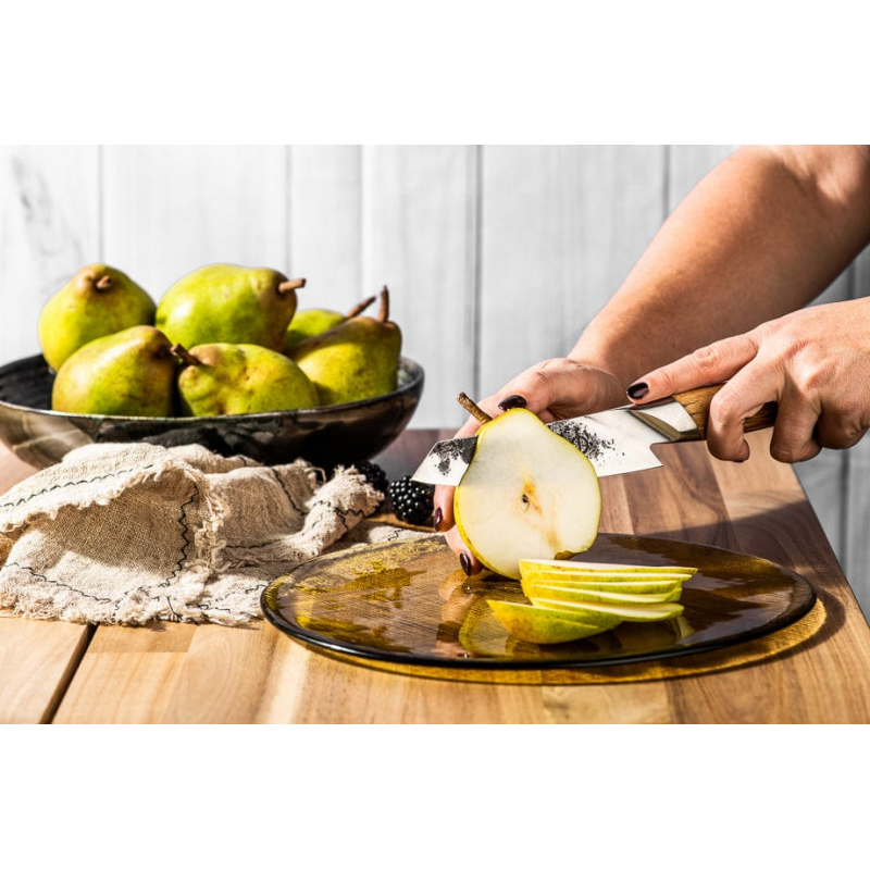 • Peilio ilgis: 14 cm, plotis: ~2 mm, 18° kampas – kompaktiškas Santoku formatas, idealiai tinkantis kapojimui, smulkinimui bei pjaustymui .