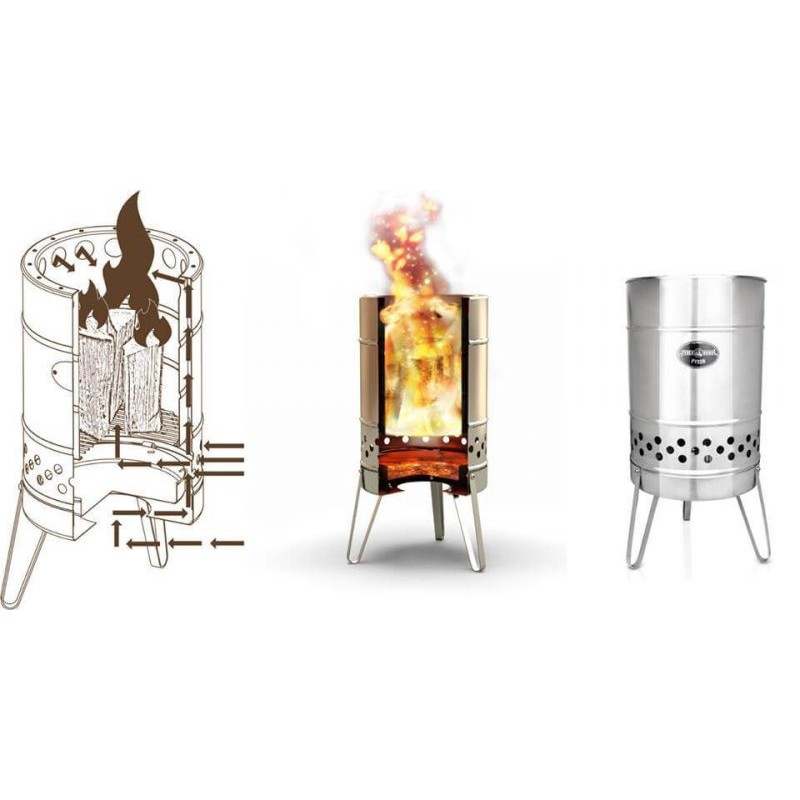 Laužavietės indas pagamintas su dviguba sienele, dugne įrengta pelenų surinkimo dėžutė.