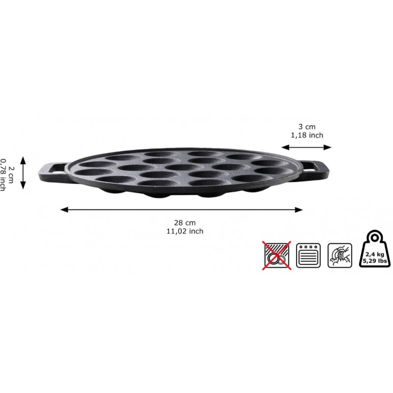 Ši „mini blynelių” keptuvė buvo termiškai apdorota, todėl yra atspari rūdims ir įbrėžimams. Keptuvė atlaiko aukštą temperatūrą ir suteikia jūsų blyneliams gardžią, traškią plutele. Ši ketaus keptuvė yra tvirta ir puikiai tinka naudoti ant bet kokio šilumos šaltinio. Keptuvę galima naudoti ant indukcinės kaitlentės, atviros ugnies ar orkaitėje (iki 250 ℃).
