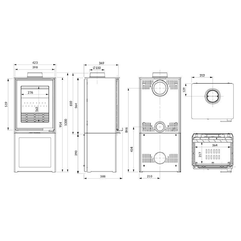 • Dūmtraukio diametras: 150 mm; maksimalus malkų ilgis: 350 mm