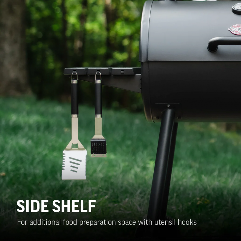 Jūsų patogumui yra šoninė lentynėlė, kuri veikia kaip rankena, kai norite kepsninę pervežti. Ant patogių lentynėlės kabliukų galėsite sukabinti savo mėgstamiausius griliaus įrankius. Priekinė lentynėlė pravers norint kažką pasidėti, kaip padažą glazūrai ar lėkštę maistui nukrauti.