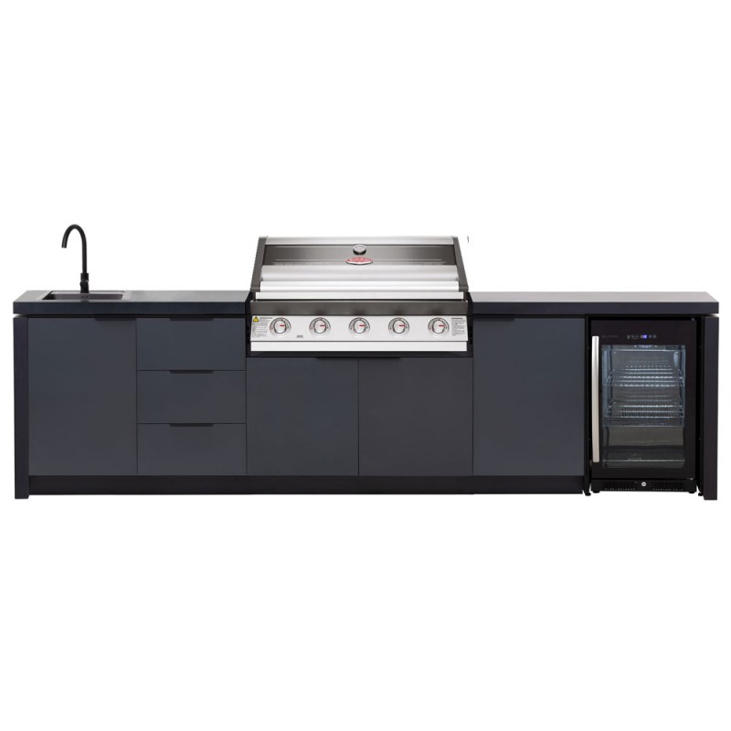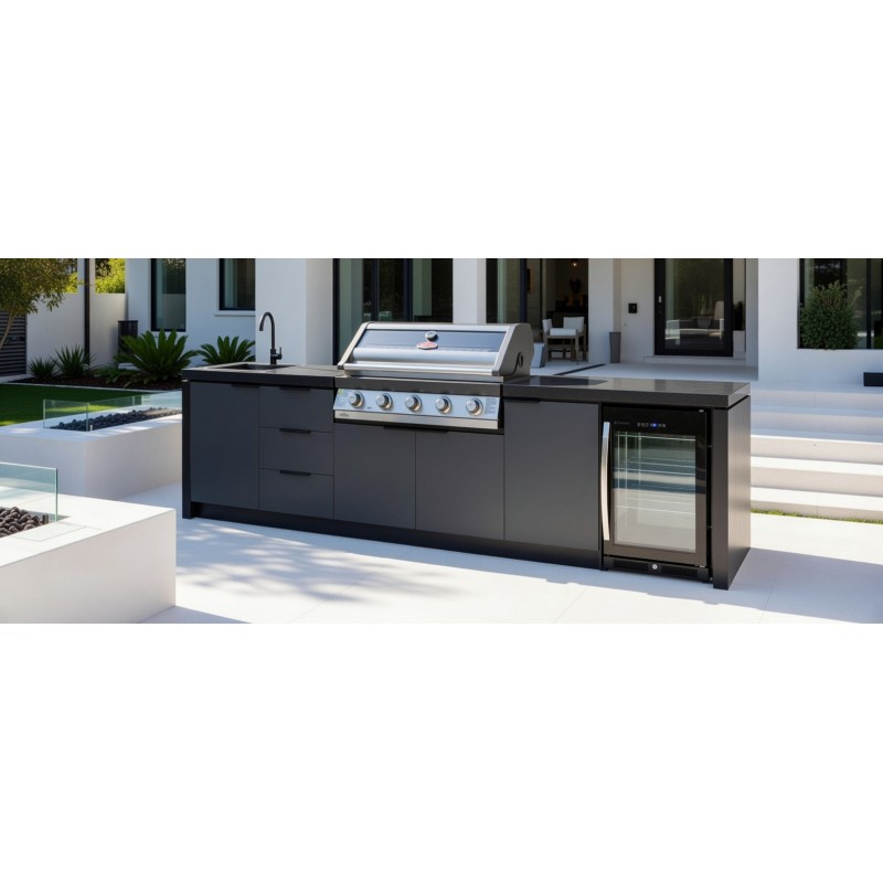Šis „Premium“ komplektas sujungia profesionalų grilį, kriauklę, šaldytuvą ir spinteles į vieną estetišką visumą. Tai užtikrina sklandų procesą: pasiruošimas, kepimas, gėrimų patiekimas bei tvarkymasis vyksta vienoje erdvėje.
