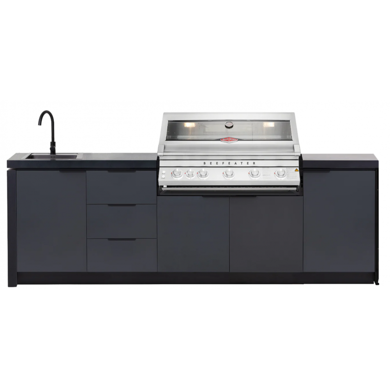 Šis „Premium“ komplektas sujungia profesionalų grilį, kriauklę ir spinteles į vieną estetišką visumą. Tai užtikrina sklandų procesą: pasiruošimas, kepimas, gėrimų patiekimas bei tvarkymasis vyksta vienoje erdvėje.