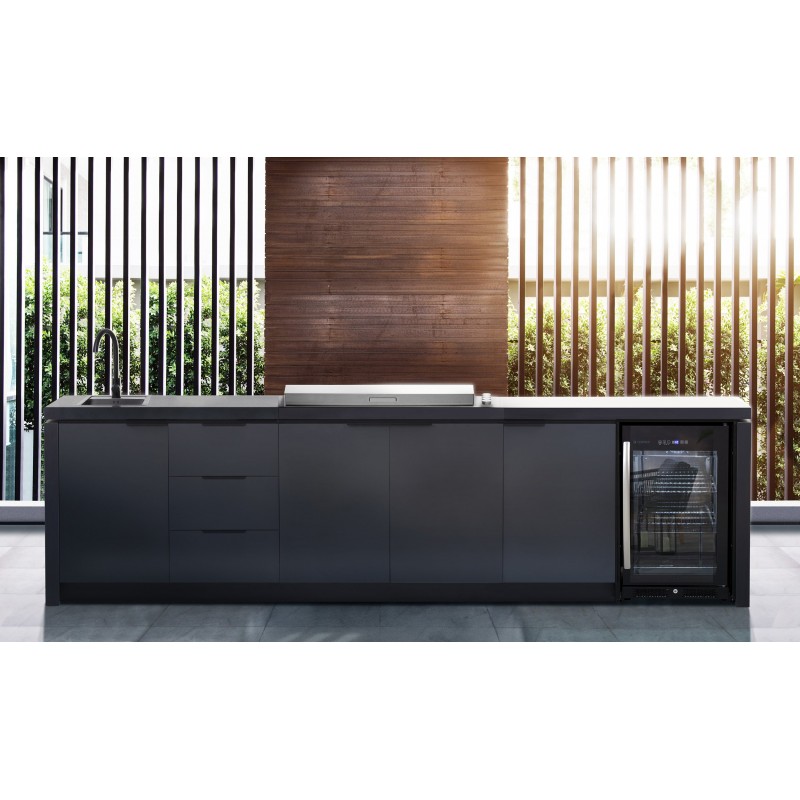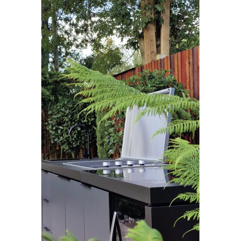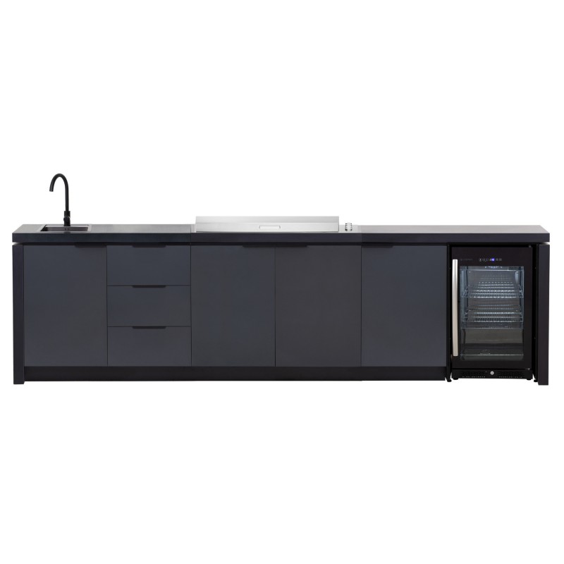 Šis „Premium“ komplektas sujungia profesionalų grilį, kriauklę, šaldytuvą ir spinteles į vieną estetišką visumą. Tai užtikrina sklandų procesą: pasiruošimas, kepimas, gėrimų patiekimas bei tvarkymasis vyksta vienoje erdvėje.