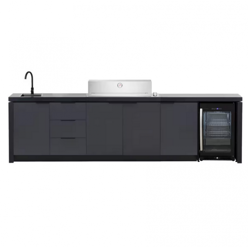 Šis „Premium“ komplektas sujungia profesionalų grilį, kriauklę, šaldytuvą ir spinteles į vieną estetišką visumą. Tai užtikrina sklandų procesą: pasiruošimas, kepimas, gėrimų patiekimas bei tvarkymasis vyksta vienoje erdvėje.