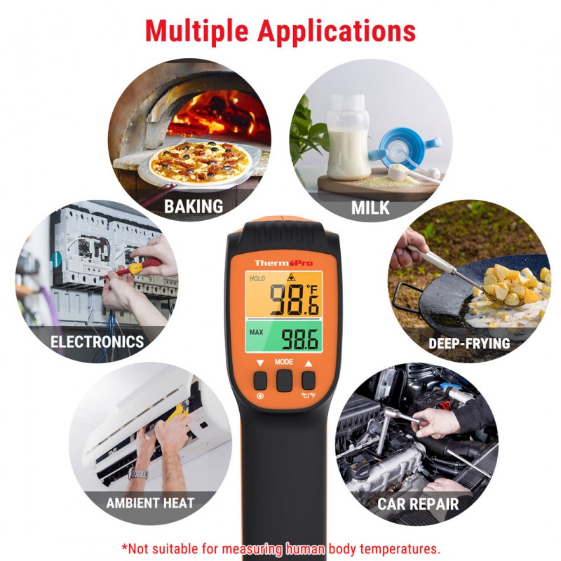 Platus temperatūros matavimo diapazonas nuo -50 °C iki +550 °C suteikia galimybę naudoti prietaisą įvairiose situacijose – nuo maisto gamybos (pvz., picos krosnys ar griliai) iki automobilio variklio ar HVAC sistemų tikrinimo. Reguliuojamas emisijos koeficientas užtikrina tikslius matavimus skirtingiems paviršiams, tokiems kaip metalas, medis ar plastikas.