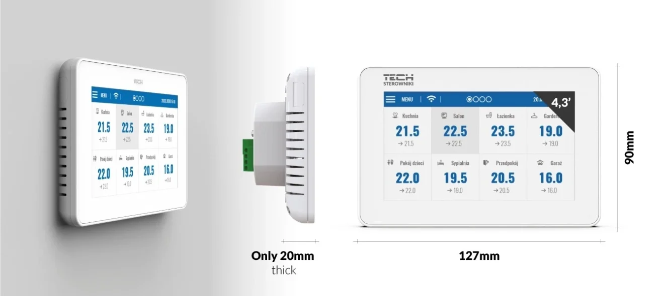 Aiškus jutiklinis skydelis leidžia lengvai valdyti antrinius įrenginius. Norint atlikti nustatymus pavaldžios zonos valdikliuose, pakanka spustelėti ekrano sritį su informacija apie jos būseną. Šildymo valdiklių valdymo pulto ekranas gali būti pritaikytas jūsų poreikiams naudojant ekrano nustatymo funkciją. Be kita ko, galite nustatyti ekrano užsklandą kaip laikrodį arba datą. Be to, vartotojas gali pasirinkti valdiklio ekrano temą ir įjungti arba išjungti klavišų garsą.