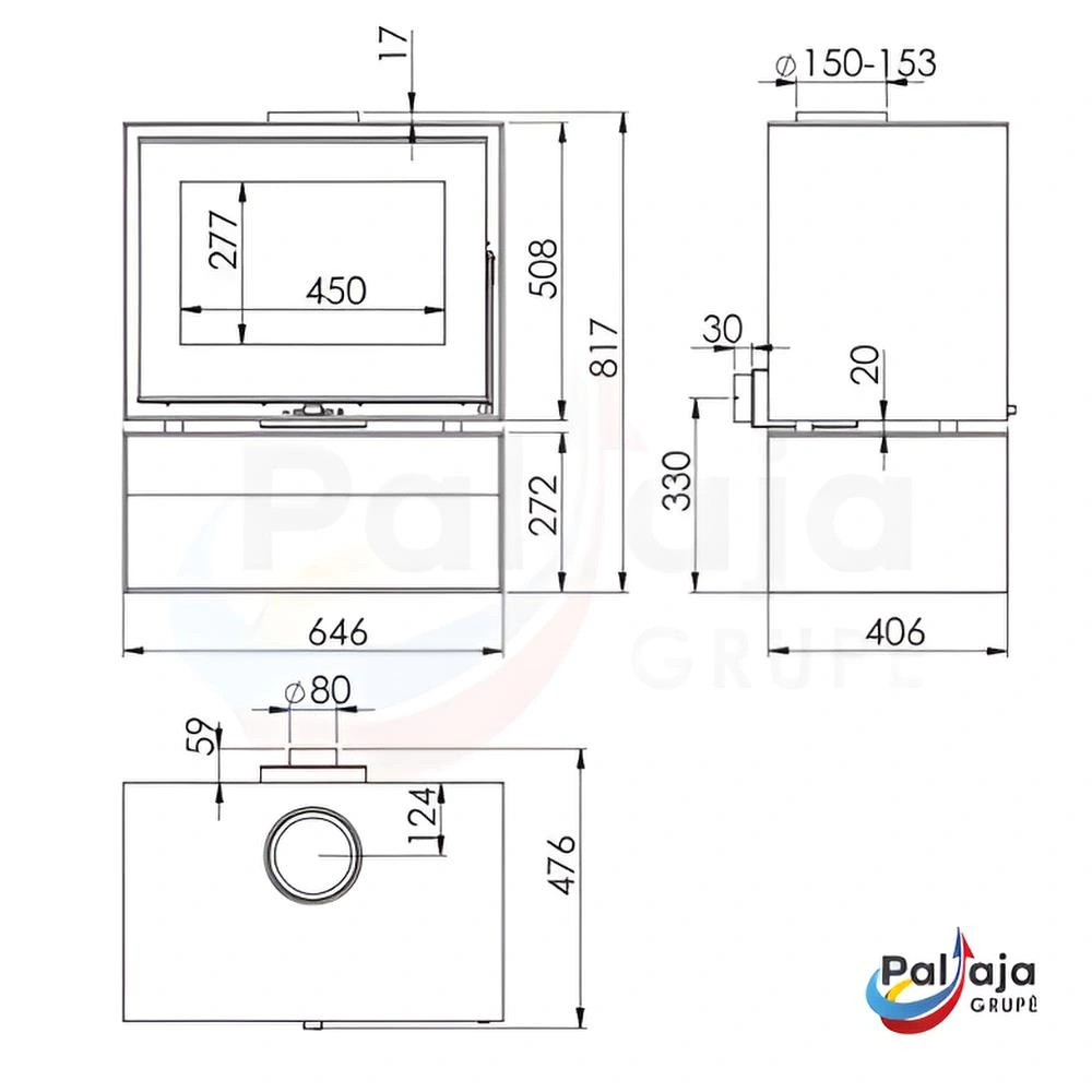 • Krosnelėje galima kūrenti iki 50 cm ilgio malkas. Dūmtraukio išvadas – vertikalus, Ø 150–153 mm skersmens. Matmenys – 817 × 646 × 476 mm, bendras svoris – 146 kg.