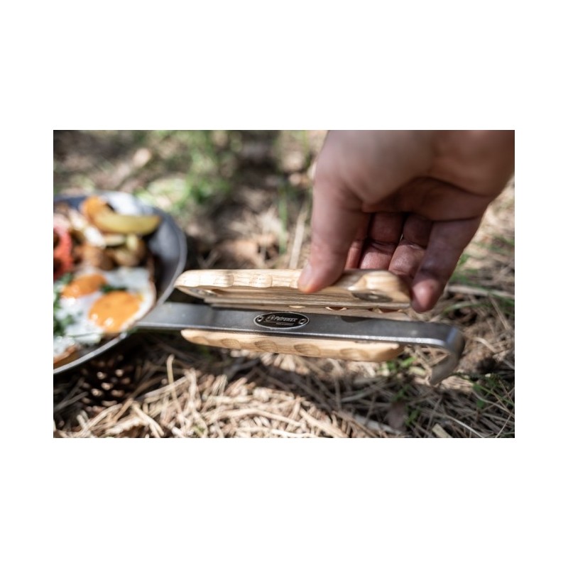 Rankena uždėklas prisitvirtina magnetu. • Ergonomiškas, manlonus liesti ir saugantis nuo karščio • Sustabdo kaitrą nuo keptuvės rankenos dėl natūralios alyvuotos medienos • Tinka visoms Petromax kalto plieno keptuvėms Su Petromax medine rankena, skirta kalto plieno keptuvėms, lengvai apsisaugosite nuo karščio kepimo metu. Ergonomiškai suprojektuota forma užtikrina geresnį sukibimą ir patogų laikymą. Medinę rankeną prie keptuvės rankenos galima pritvirtinti viena ranka, naudojant magnetinį užraktą.