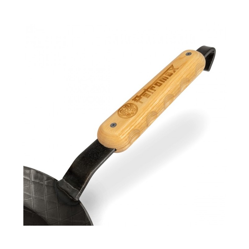 Iš medienos pagamintos rankenos apgaubia keptuvės rankeną ir sustabdo karščio perdavimą.