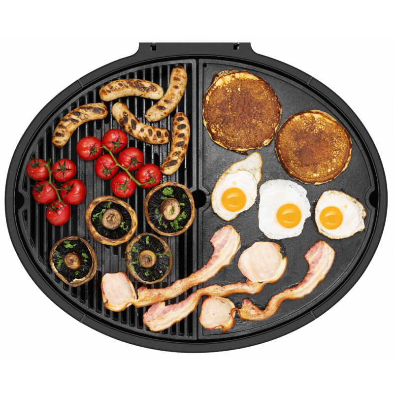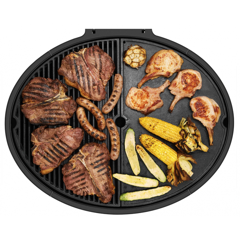 • Kombinuotas paviršius (plokštė + grotelės) – vienu metu galima kepti steiką, kiaušinius, šoninę, daržoves ar blynus.