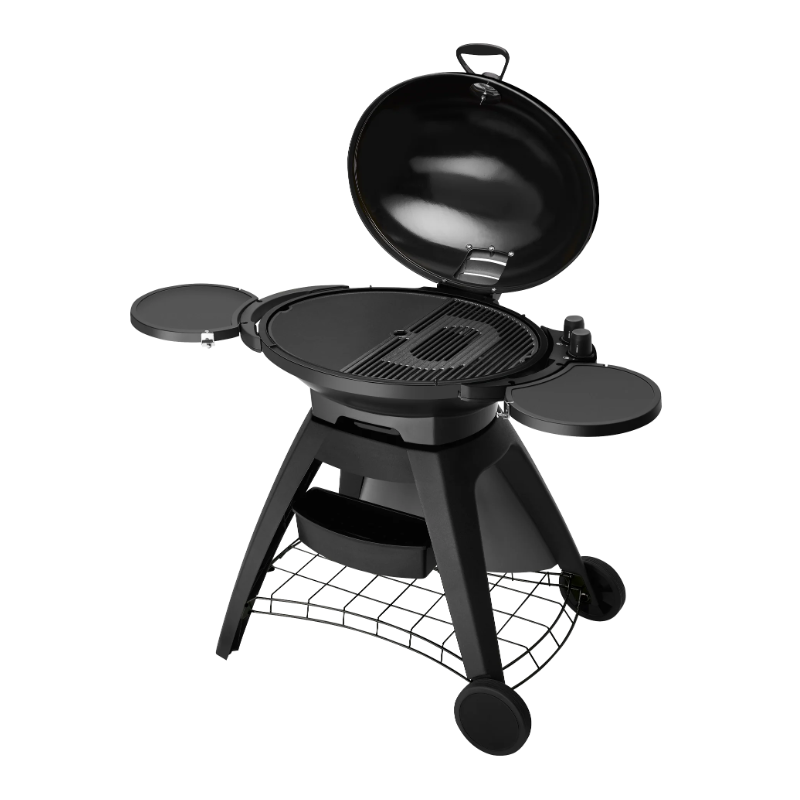 BIGG BUGG – tai 2 degiklių dujinis grilis su stovu, sukurtas tiems, kas nori didelio kepimo ploto, stabilumo ir mobilumo. Pagrindiniai privalumai – vitražinio emalio dangtis, didelė ketaus kepimo zona ir 2 nepriklausomai valdomi nerūdijančio plieno degikliai. Du degikliai leidžia tiksliai reguliuoti kaitrą ir patogiai dirbti su netiesiogine kaitra (pvz., vienas degiklis įjungtas, kitas – išjungtas). Gamintojas akcentuoja stabilų karštį ir kaitros kontrolę be „flare ups“ (mažiau nekontroliuojamų liepsnos pliūpsnių nuo riebalų).