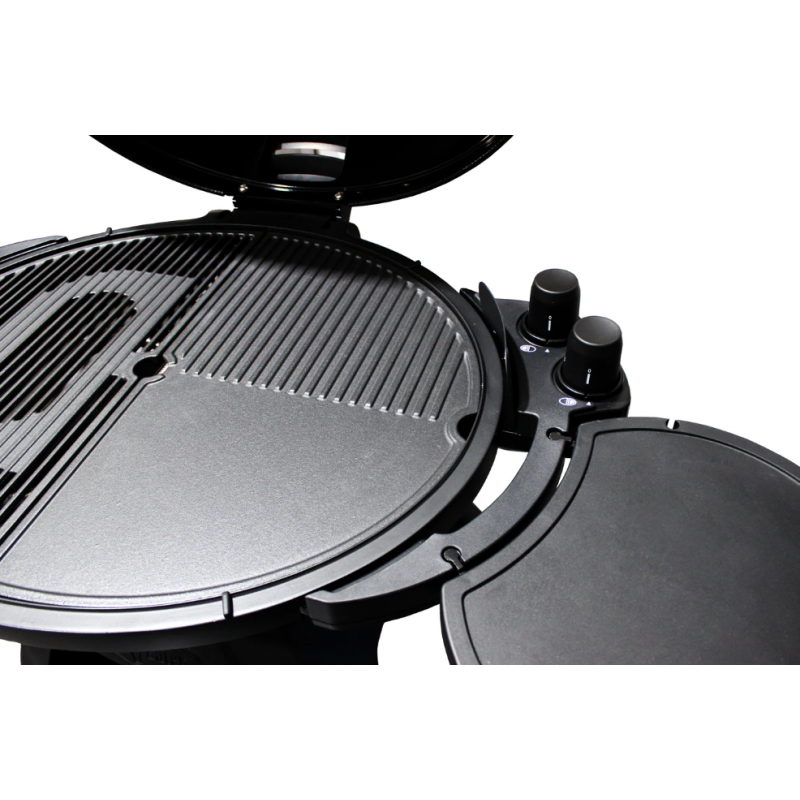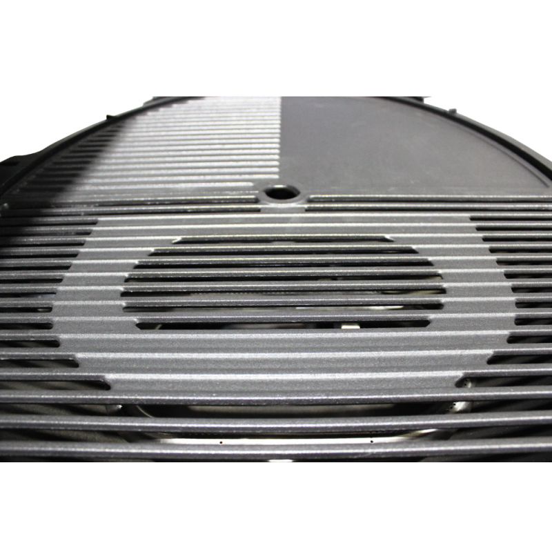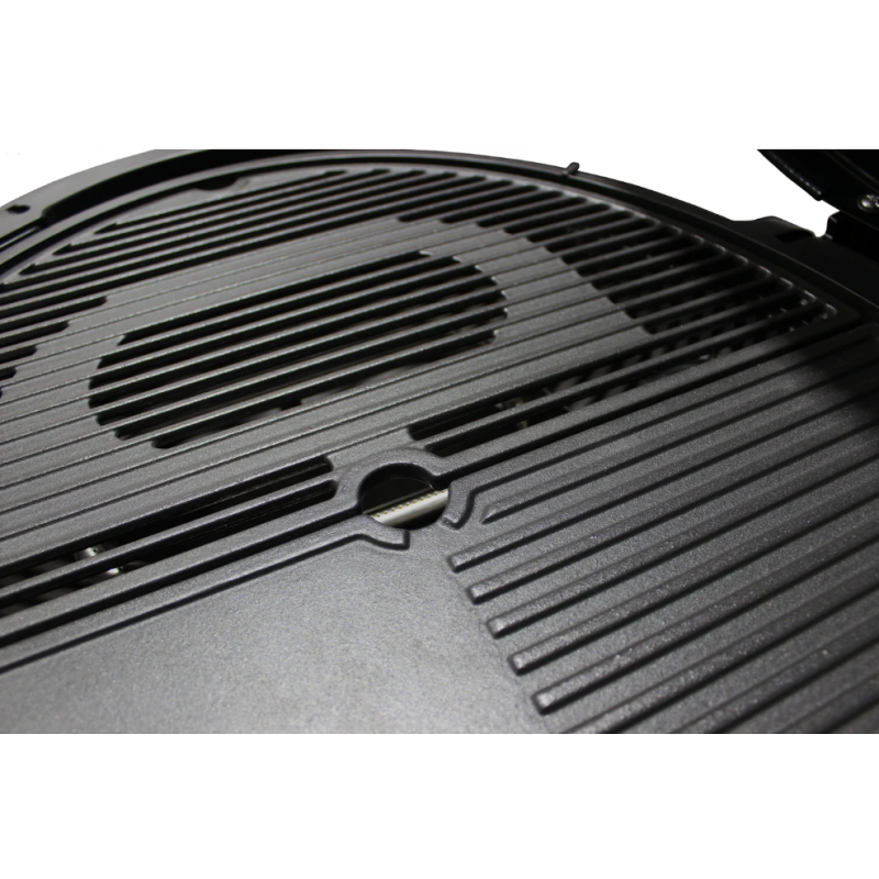 • Kombinuotas paviršius (plokštė + grotelės) – vienu metu galima kepti steiką, kiaušinius, šoninę, daržoves ar blynus.