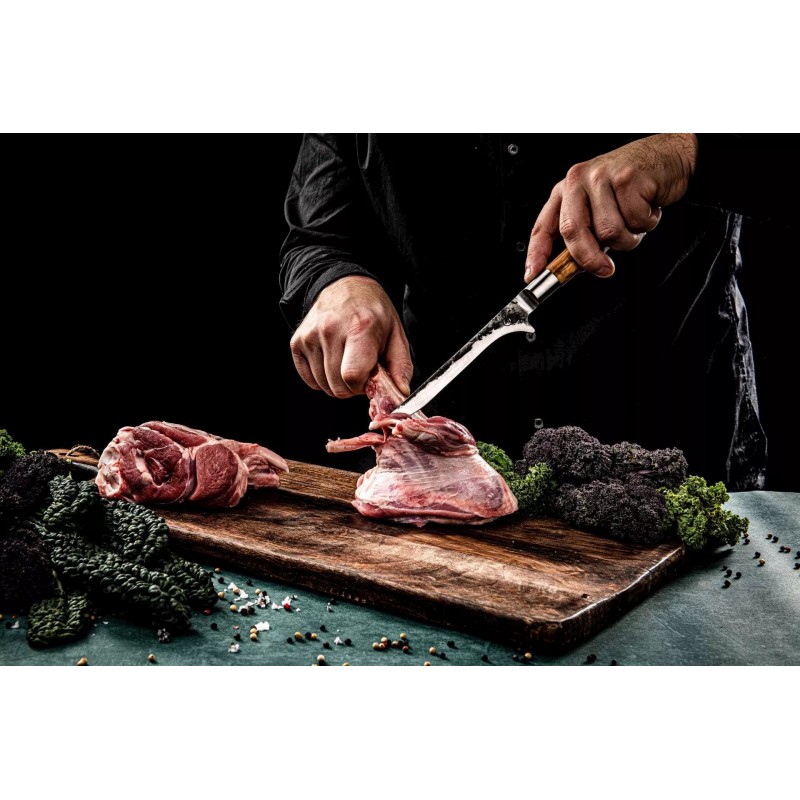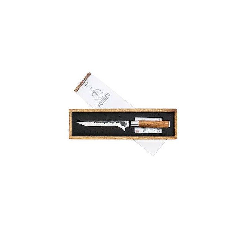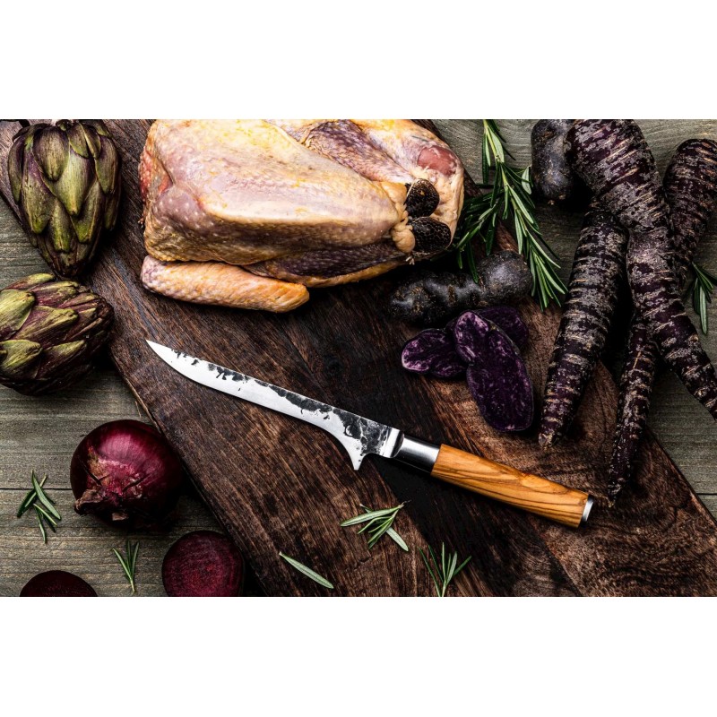 Forged Olive Nukaulinimo Peilis – tai rankų darbo peilis, skirtas atskirti mėsą nuo kaulų. Jis derina Japoniško plieno aštrumą, ploną ašmenį ir elegantišką alyvmedžio rankeną.