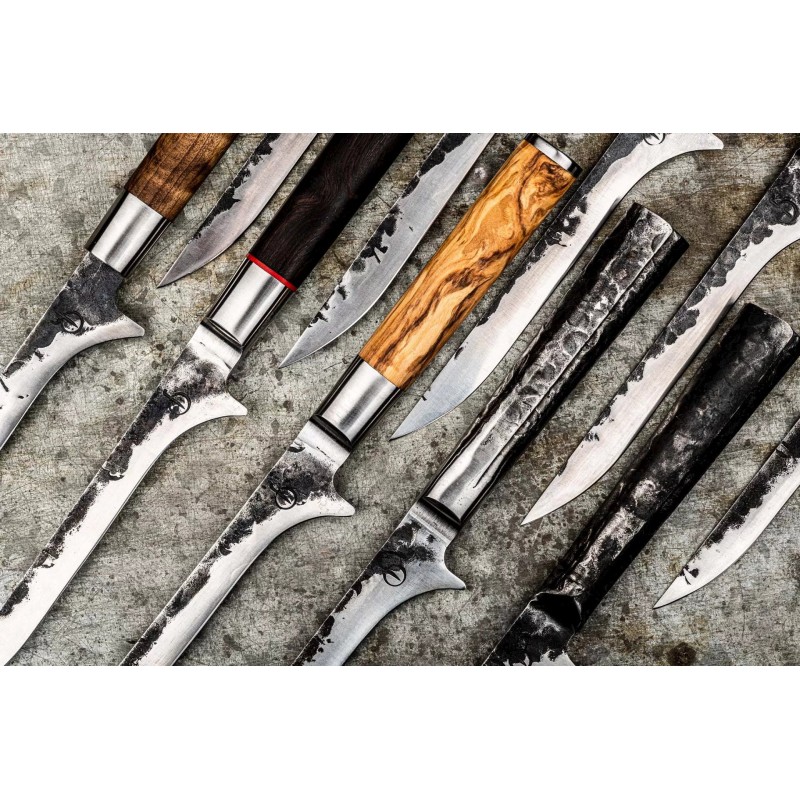 • „Hand‑forged“ – kiekvienas peilis yra unikalus, rankų darbo.