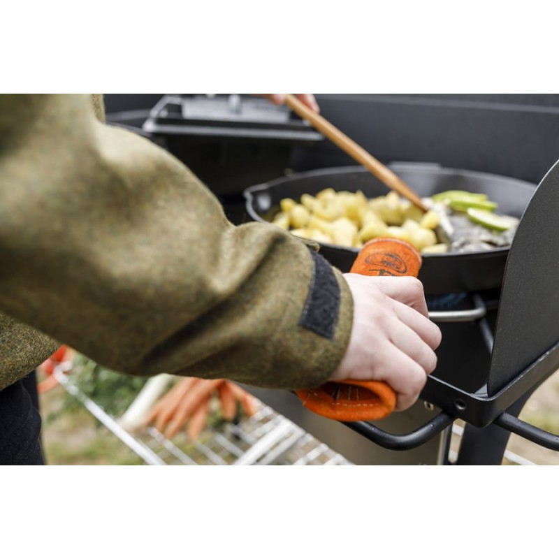 Laikiklis pagamintas iš grubios odos, yra plonai išklotas aramidiniais pluoštais. Tiesiog uždėkite rankenos laikiklį ant keptuvės rankenos ir lengvai perkelkite keptuvę.