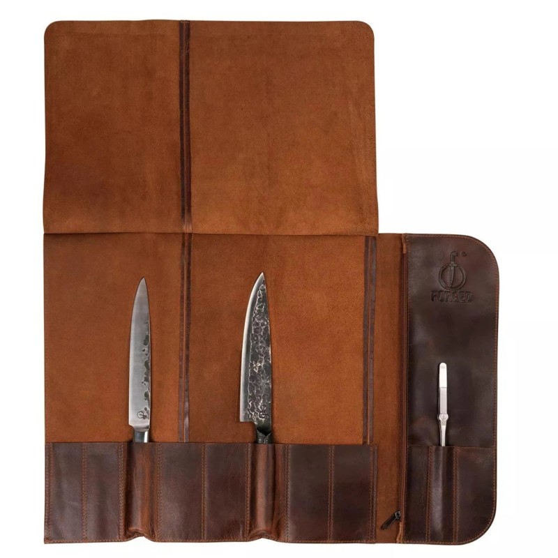 Šis peilių dėklas yra pagamintas iš 100% išdirbtos galvijų odos, todėl yra ne tik tvirtas, bet ir elegantiškas. 1,5 mm storio aplanke telpa 8 peiliai, yra 3 papildomos kišenės smulkiems priedams ar mažiems peiliukams.