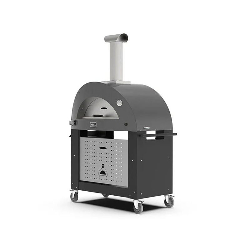 • Sustiprinta važiuoklė: Keturi pramoninio tipo ratai su stabdžiais leidžia lengvai valdyti net ir pilnai sukomplektuotą, sunkią krosnį ant įvairių terasos dangų.