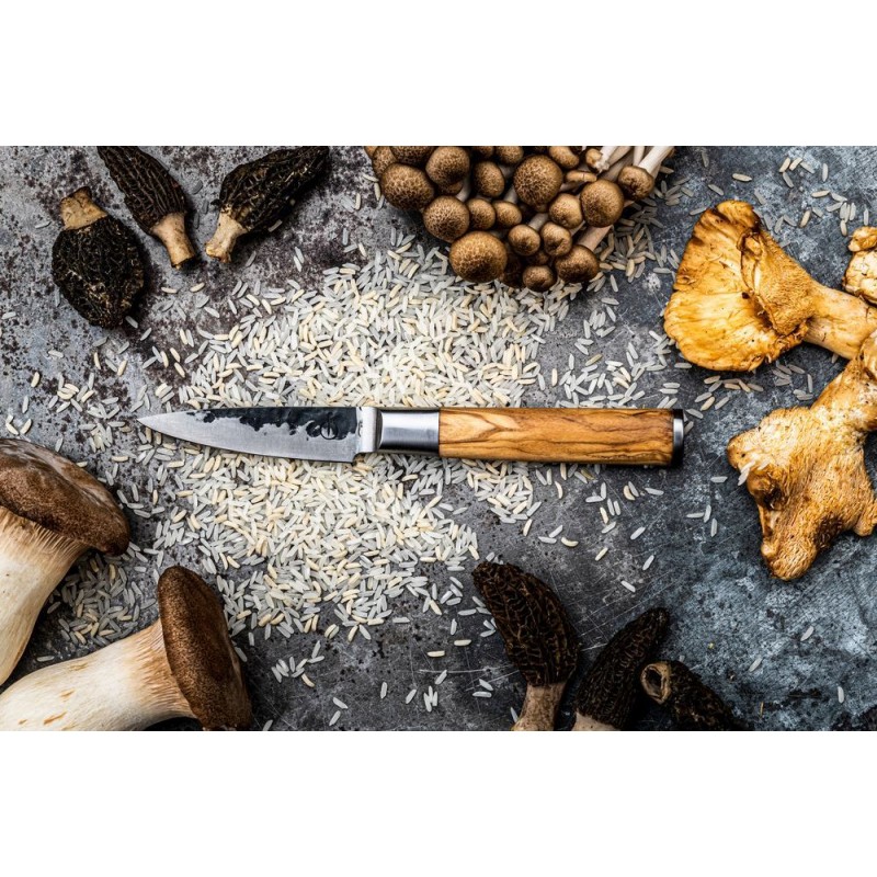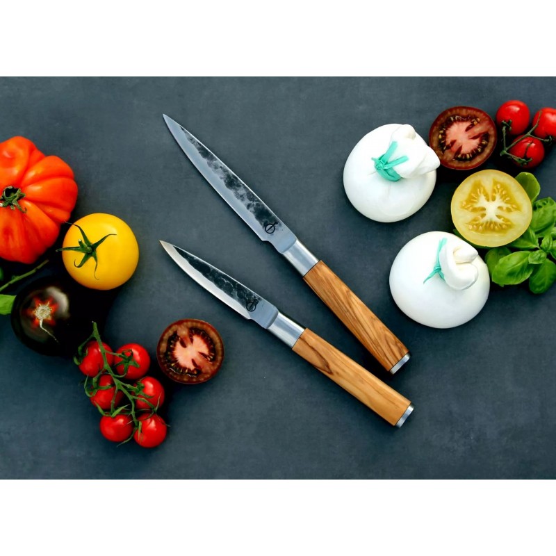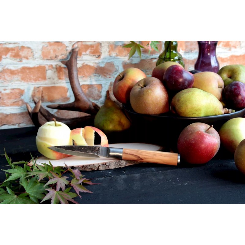 Šis pjaustymo peilis yra mažiausias Forged Olive narys. Tai itin lengvas peilis su plonu ašmeniu. Puikiai tinka pjaustyti ir skusti daržoves. Forged alymdedžio peiliai yra pagaminti iš is japoniško 440 plieno ir turi 58 Rockwell kietumo lygį. Visi Forged peiliai yra rankų darbo, pateikti prabangioje dėžutėje.