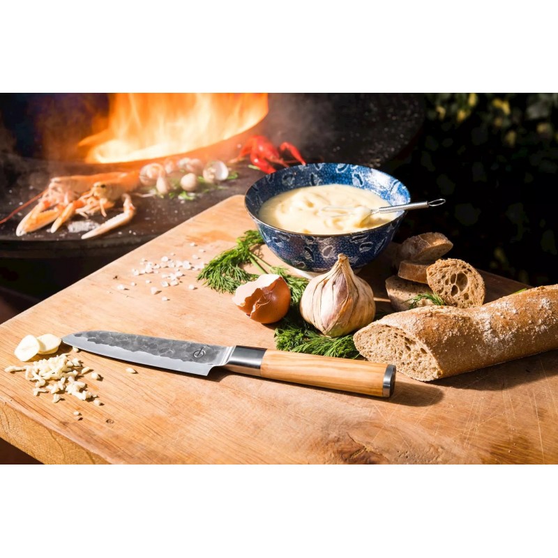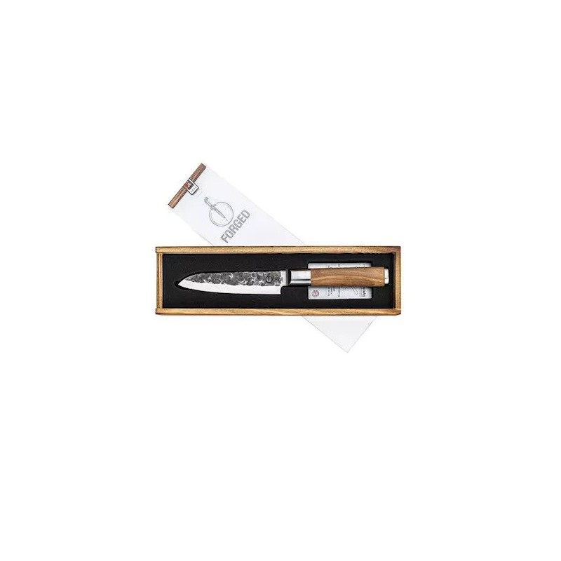 Forged Olive santoku peilis yra japoniška šefo peilio versija. Žodis „santoku“ reiškia „trys vertybės“. Peilis yra labai universalus ir puikus pasirinkimas Jūsų virtuvei. Forged alymdedžio peiliai yra pagaminti iš is japoniško 440 plieno ir turi 58 Rockwell kietumo lygį. Visi Forged peiliai yra rankų darbo, pateikti prabangioje dėžutėje.