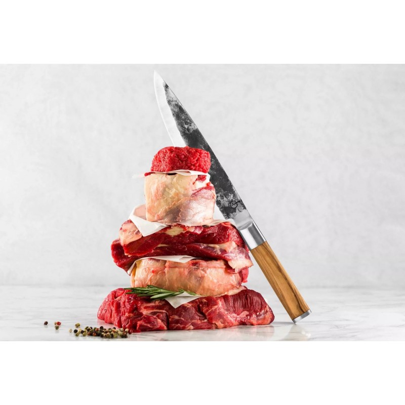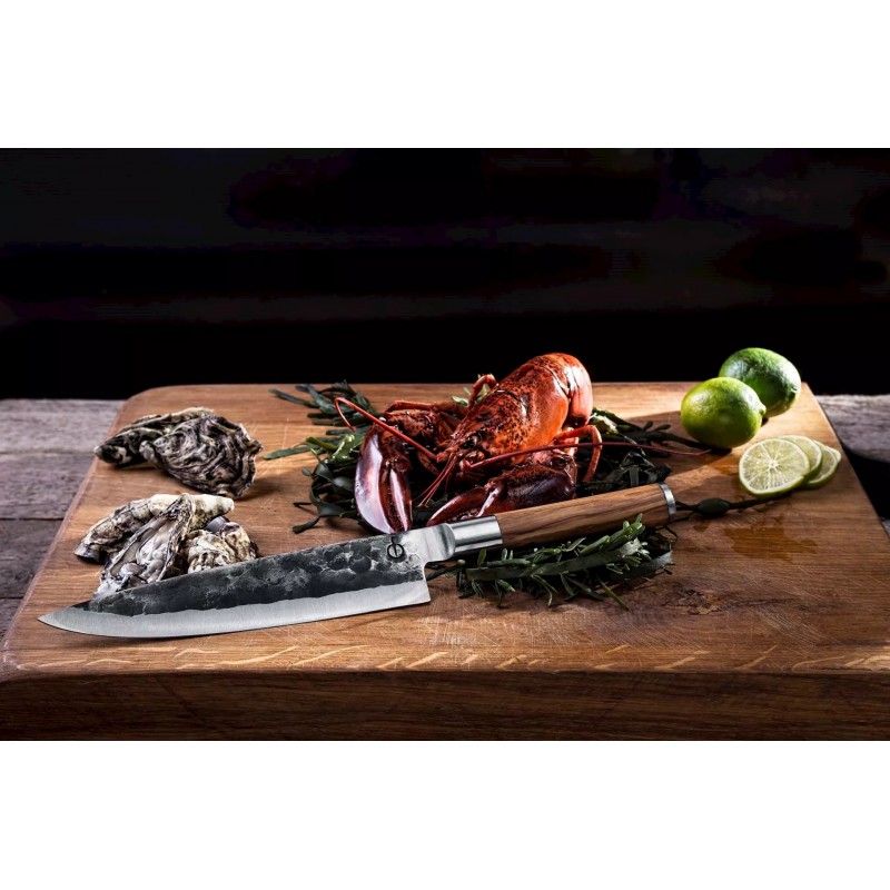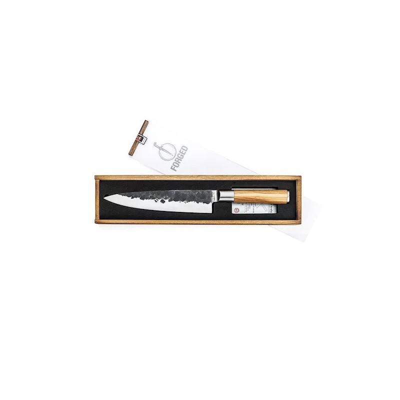 Ĺ efo peilis – niversaliausias peilis virtuvÄ—je ir neatsiejamas kiekvieno šefo pagalbininkas. Puikiai tinka pjaustyti mÄ—sai, Ĺľuviai ar darĹľovÄ—ms, taip pat ir smulkioms ĹľolelÄ—ms. Ašmens forma yra tipinÄ—, europietiško stiliaus. Forged alymdedĹľio peiliai yra pagaminti iš japoniško 440 plieno ir turi 58 Rockwell kietumo lygÄŻ. Visi Forged peiliai yra rankĹł darbo, pateikti prabangioje dÄ—ĹľutÄ—je.