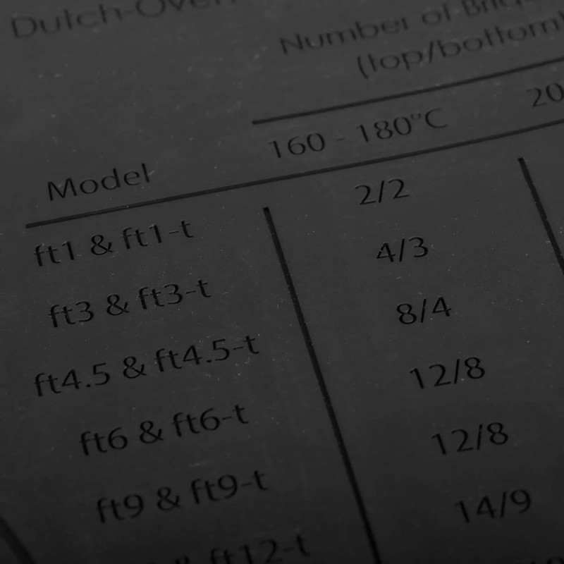 • Briketų kiekio lentelė: kilimėlio nugaroje yra lentelė kurioje parodyta kiek briketų reikia atitinkamo dydžio puodui.