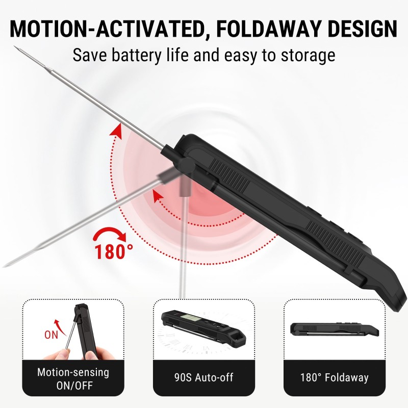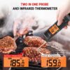 • Du termometrai viename: Termometras turi momentinį zondą ir infraraudonųjų spindulių termometrą, tad galima matuoti tiek vidinę maisto temperatūrą, tiek paviršių temperatūrą.