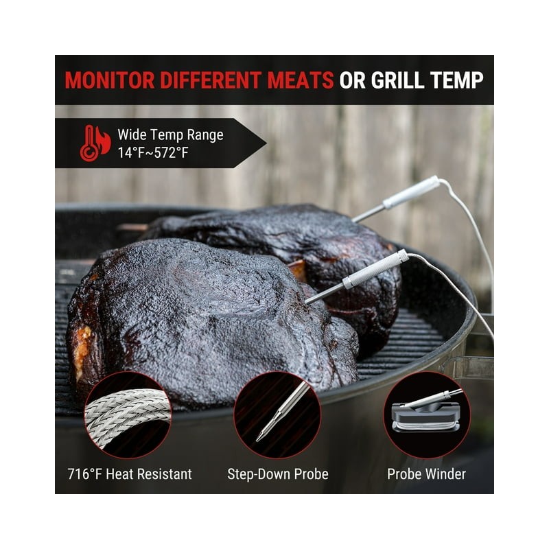 • 200 metrų belaidis ryšys: ThermoPro TP920W turi Bluetooth 5.0 technologiją, kuri teikia stiprų ir nenutrūkstantį ryšį, kad galėtumėte stebėti temperatūrą savo telefone.