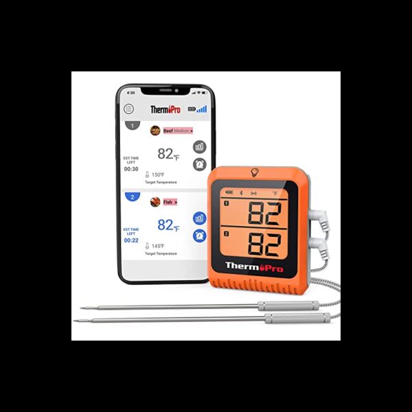Pagerinkite savo kepimo patirtį su ThermoPro TP920W! Termometras turi 200 metrų Bluetooth atstumą, tad leis lengvai stebėti maisto kepimo būseną Jūsų telefone. Šis termometras turi 2 nerūdijančio plieno zondus, kurie pasirūpins, kad Jūsų ruošiamas maistas bus iškeptas idealiai, sekant vidinę, bei išorinę temperatūrą. ThermoPro BBQ programėlė palengvins kepimo eigą. Joje gausite pranešimus dėl maisto, rekomenduojamas temperatūras, grafikus, modifikuojamus priminimus. Programėlės algoritmas parinks tinkamus kepimo laikus, tad galėsite mėgautis tobulai iškeptu maistu kiekvieną kartą.Termometras taip pat turi pakraunamą bateriją ir ryškų LCD ekranėlį.