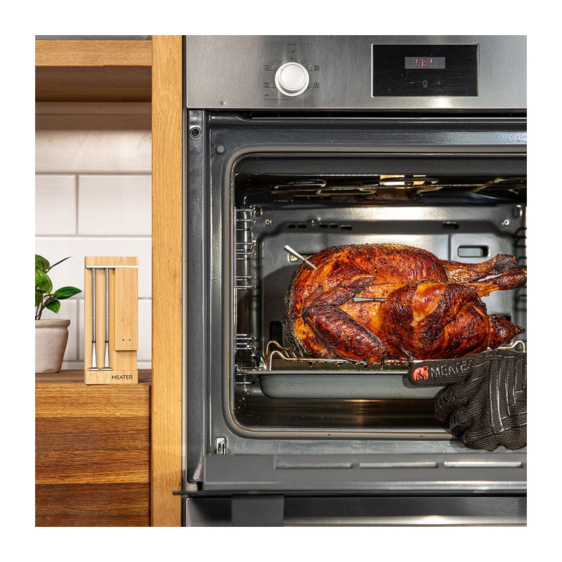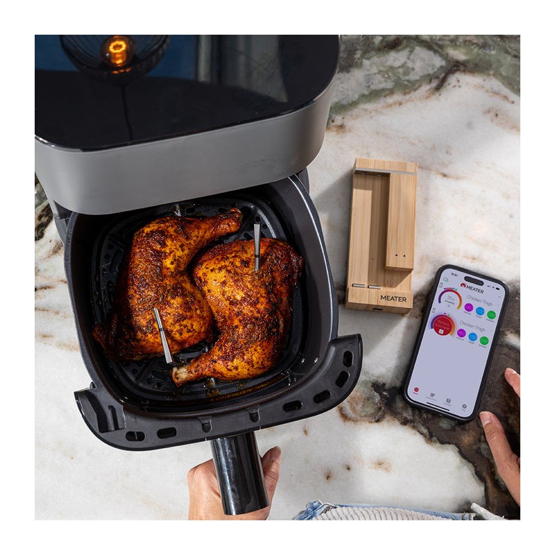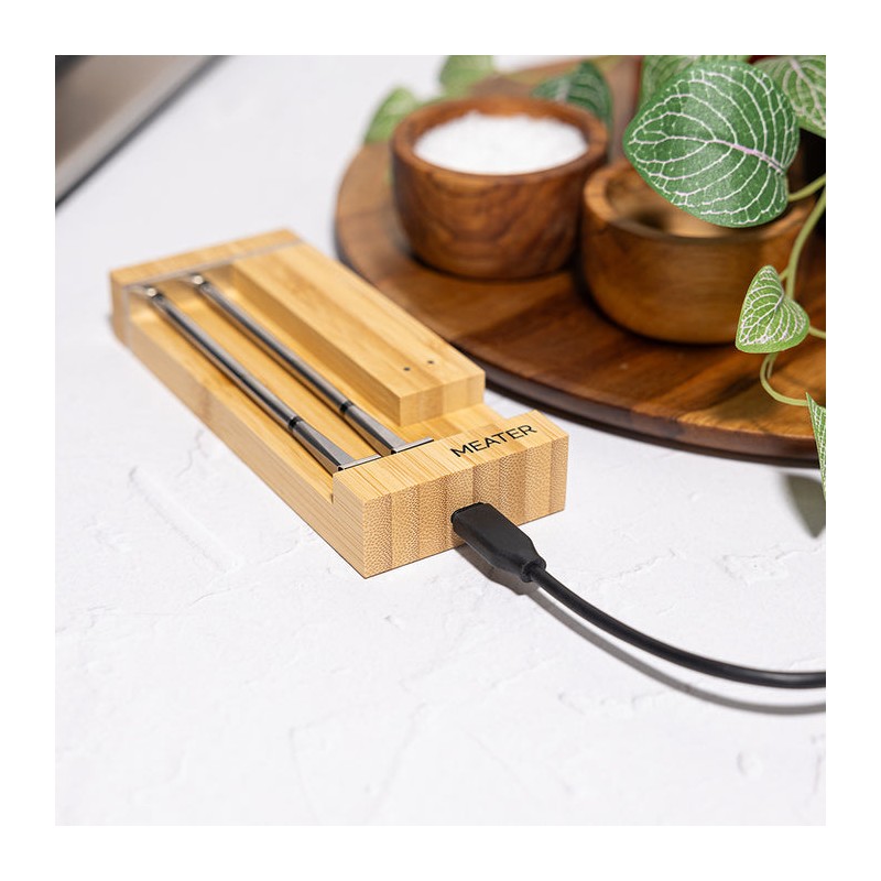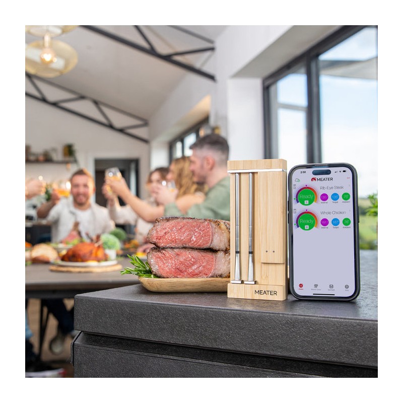 MEATER Pro Duo – naujos kartos, visiškai belaidis termometras su dviem zondais ir Wi-Fi režimu. Kiekviename zonde įtaisyti keli jutikliai vienu metu stebi vidinę mėsos ir aplinkos temperatūras, o programėlė telefone padeda suplanuoti kepimą, sekti progresą ir gauti įspėjimus. Rinkinys idealiai tinka, kai vienu metu ruošiate skirtingas mėsas ar kepsnius – pvz., krūtinėlę ir kumpį.