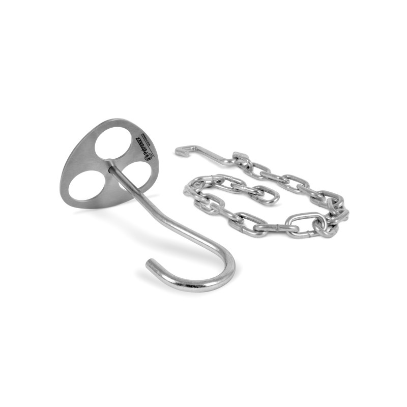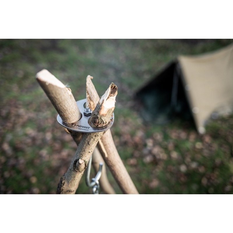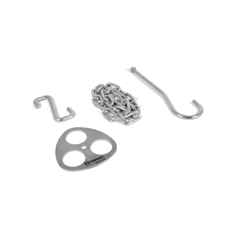 Nerūdijančio plieno trikojo tvirtinimo žiedas, kabliai ir grandinė. Nuo šiol, turėdami šį rinkinį galėsite naudotis trikoju bet kur, užteks tvirtinimo žiedu sujungti tris šakas ir jau galėsite ruošti maistą virš ugnies.