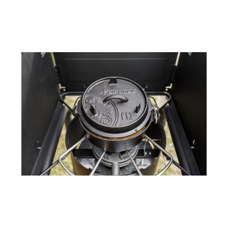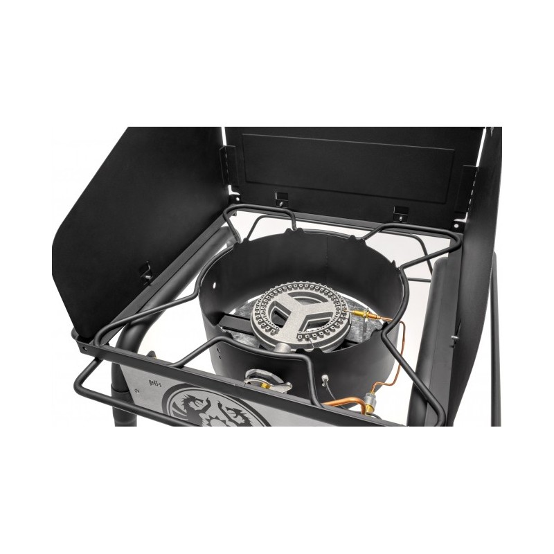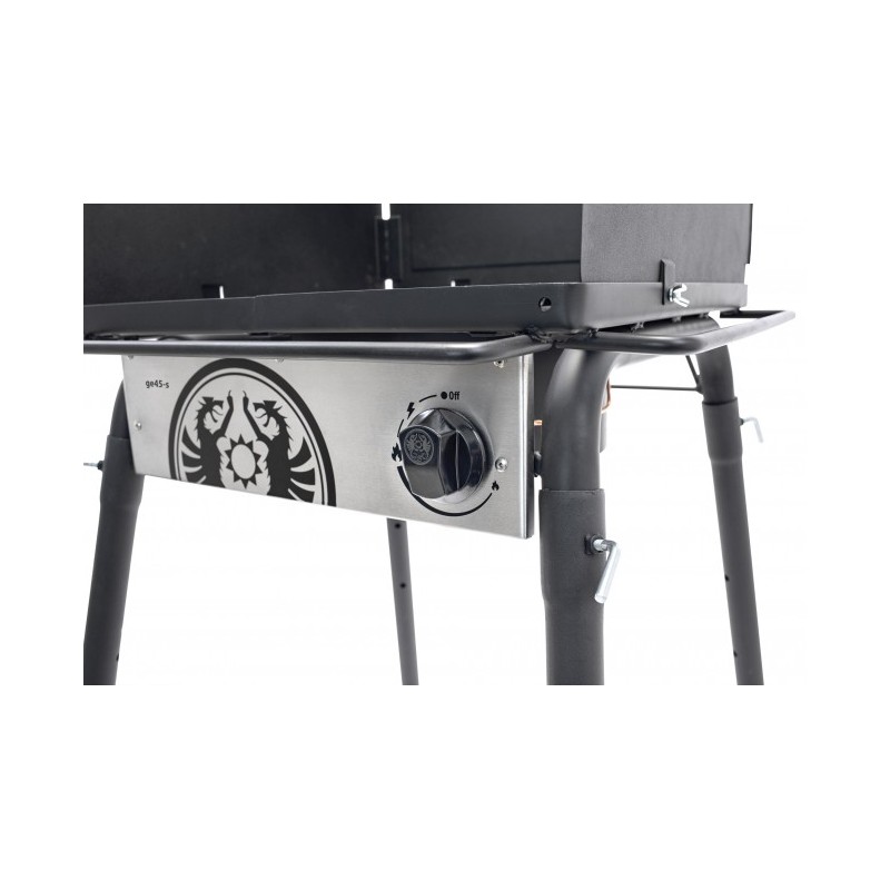Tuo pačiu metu pasukus jungiklį galima nuolat reguliuoti šilumą. Integruotas liepsnos stebėjimas užtikrina papildomą jūsų saugumą: jei ugnis netyčia užgęsta, dujų tiekimas automatiškai nutrūksta. Pridedamas 50 mb slėgio reguliatorius užtikrina pastovų dujų srautą veikimo metu ir taip sukuria ypač tolygią liepsą gaminant be dūmų ir be kibirkščių lauke.